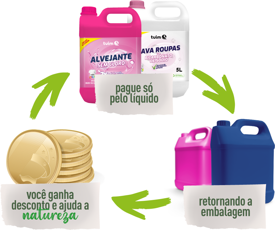 Inovamos, possibilitando que você que já reutiliza a embalagem, da água e do gás, também possa reutilizar a embalagem dos produtos de limpeza TUIM, pagando só pelo liquido e ajudando o meio ambiente.